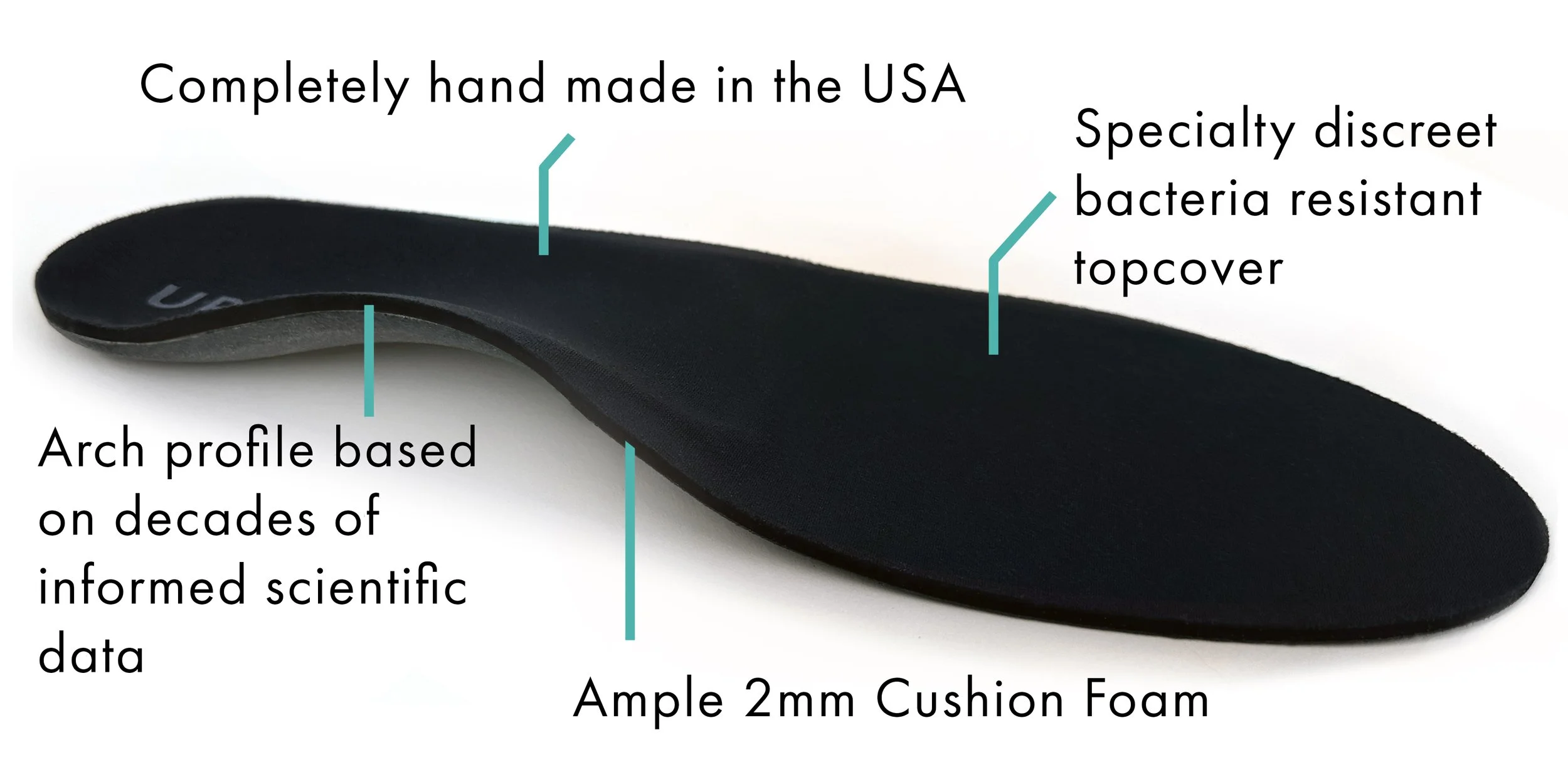 UpLift custom inserts are crafted using high-density polyethylene, enabling the orthotics to effectively prevent foot collapse without compromising material integrity over time. They are also equipped with anti-bacterial Neolon top covers, and are heat-adjustable, allowing you to lower or raise your arch for the ideal fit.
